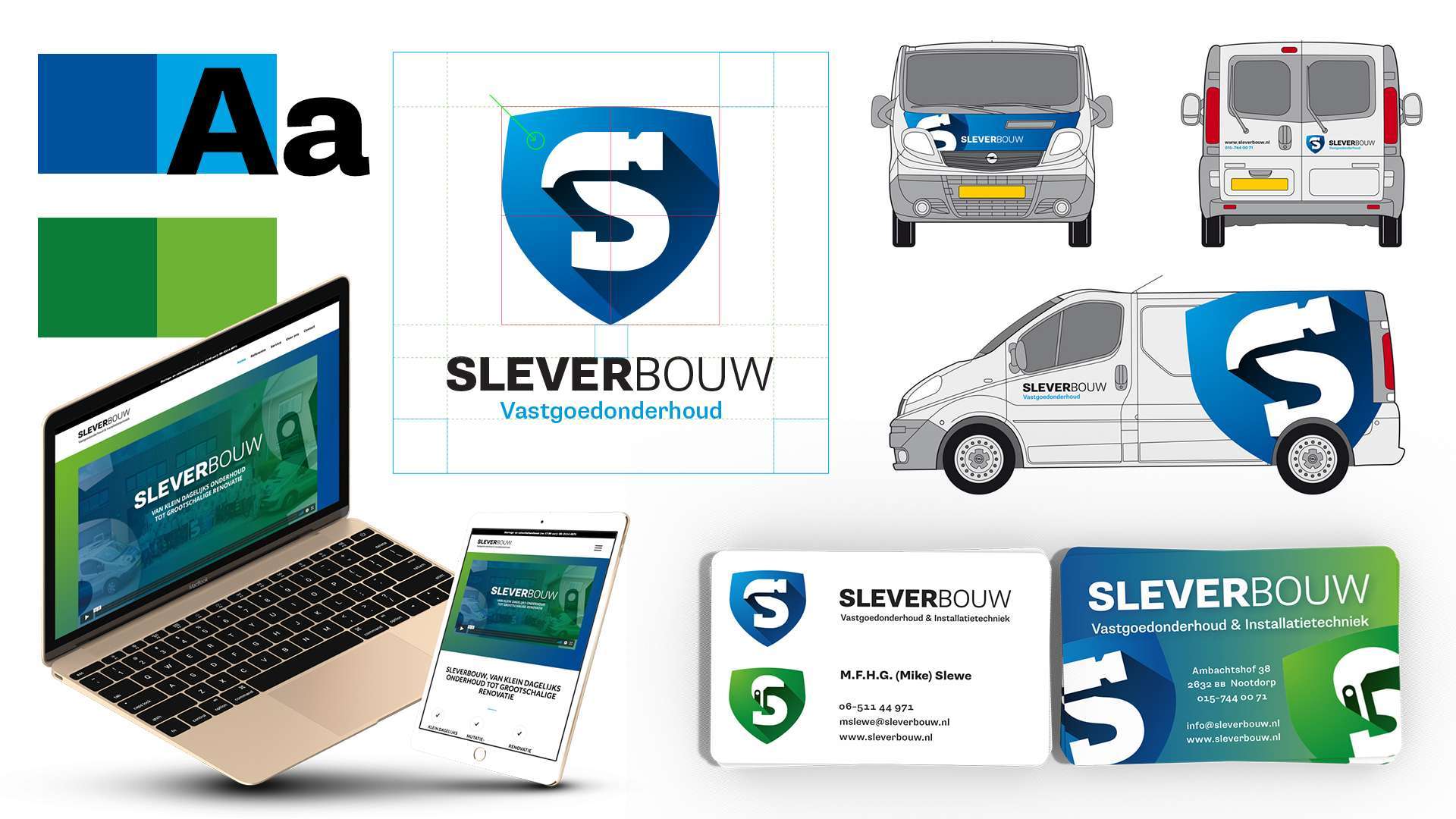 Het onderscheidende wagenpark van SleVerBouw Vastgoedonderhoud & Installatietechniek uit Nootdorp heeft uitgesproken ontwerp. Zowel het logo ontwerp van Installatietechniek als Vastgoedonderhoud heeft een karakteristiek beeldmerk, uitgesproken kleuren en maakt gebruik van een heel herkenbaar lettertype.